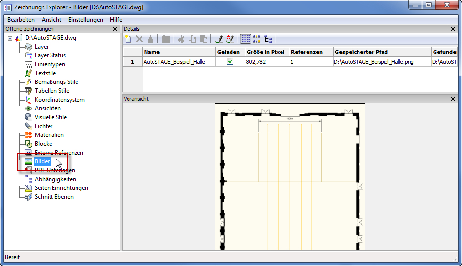 Über den Zeichnungs-Explorer (Werkzeuge-> Zeichnungs-Explorer->Bilder...) werden alle Pixelbilder in der Zeichnung verwaltet. Im Zeichnungs-Explorer kann auch der Pfad einer Bilddatei nach einer Änderung des Pfads angepasst werden.