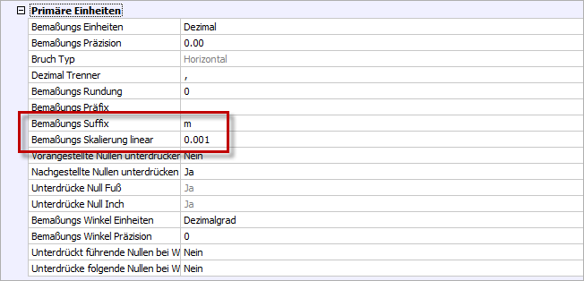 Die Primäreinheiten bestimmen, mit welchem Einheitenzusatz das Längenmaß der Bemaßung angegeben wird.
