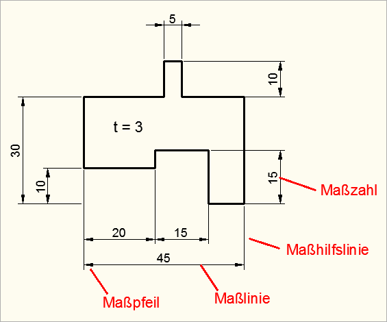 oDie Dicke des Werkstücks (engl. Thickness = t) wird innerhalb des Werkstücks eingetragen, bei Platzmangel außerhalb.